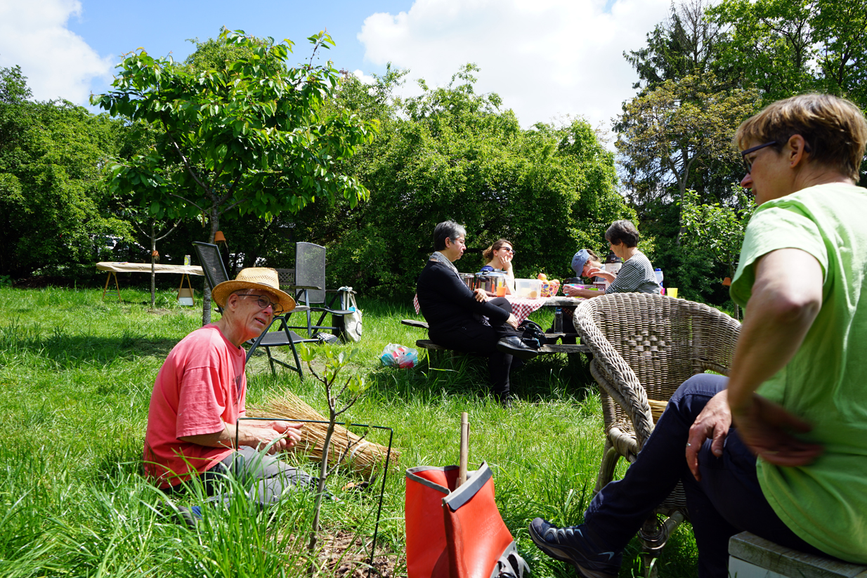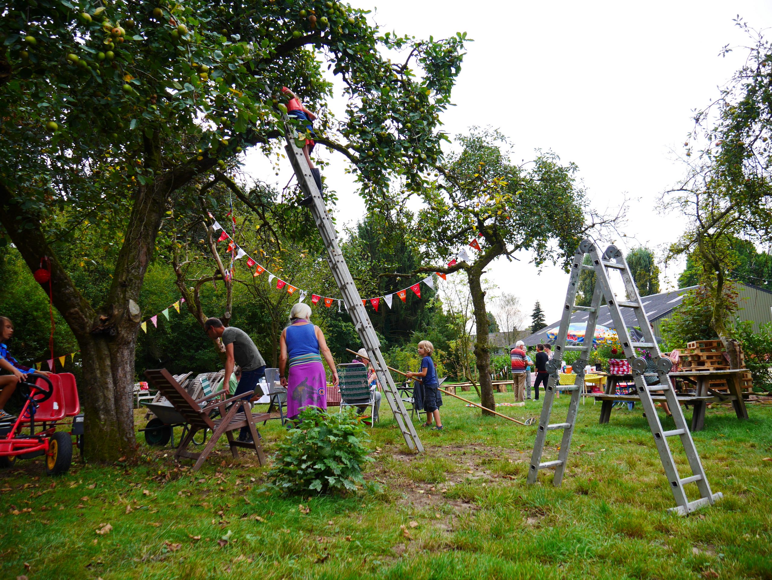 Met alle initiatieven, expertise en menskracht vanuit de buurt is het de afgelopen 5 jaar een boomgaard vol verhalen geworden waar heel veel mensen een stukje verhaal hebben meegeschreven. Een kunst- en muziekfestival, paddenpoel, stapelbank, ambachtelijke middag, theemiddag, sinusmaaien, kabouterhuisjes, (groen)beheer en onderhoud, fruitbomen snoeien, kunstvitrine, Nachttheater, minibieb, meewerkdagen, NL-doet en Burendag, nestkastjes, Pilates, noem het maar. En natuurlijk genieten van de plek, alleen of met vrienden, klimmen in de pruimenboom, op zoek naar salamanders, een juf met haar klas, een werkoverleg in Coronatijd. De nodige kennis opgedaan bij KNHM, SLG, Gelderse Natuurmakers en de Leefbaarheidsalliantie Gelderland. Heel fijn dat we als buurt onze gang mogen gaan op dit stukje gemeente grond.